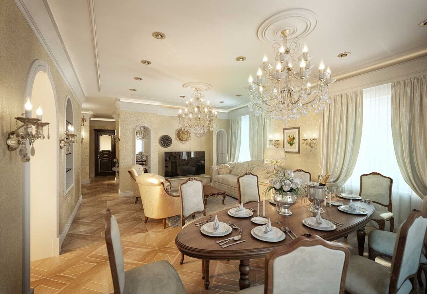 Цветовая палитра: спокойные оттенки оливкового и кремового цветов, голубой, зеленый и другие пастельные тона. Стены лучше всего обшить деревом, если это слишком дорого, то его можно заменить тканью. Пол – только дорогостоящий паркет из натуральных древесных пород, керамическое покрытие будет уместным только на кухне. Двери здесь будут лишними, проемы лучше украсить пилястрами, подчеркивающими классический стиль.