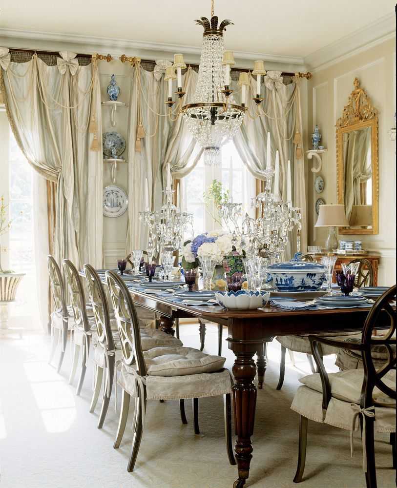 Центр комнаты нужно сделать знаковым, например, здесь можно повесить огромную люстру, окруженную медальоном из гипса. Остальные предметы декора и мебель нужно будет расставлять симметрично, отталкиваясь от центральной части комнаты. Мебель должна быть с плавными ножками, изготовленная только из дерева. Здесь очень уместны орнаменты, ручная работа, резка по дереву, золочение и обивка стульев дорогой тканью. Очень уместными будут картины, однако нужно учитывать габариты комнаты, а рамы обязательно должны быть позолочены.
