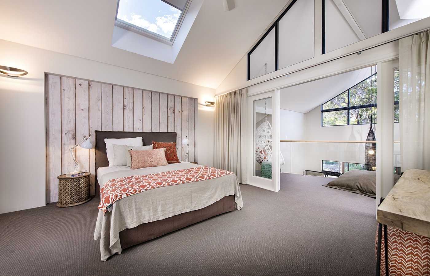 Заметным элементом в спальной комнате является конструкция из шпона, перетекающая со стены у изголовья кровати на потолок.