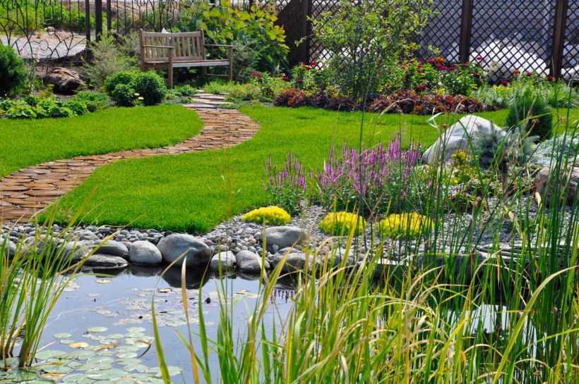 Водоемы придадут участку ощущение дополнительной прохлады и создадут уютное место для отдыха. Это могут быть небольшой пруд с пряными травами по краям, бассейн или очаровательный сухой ручеек, пробирающийся по территории.