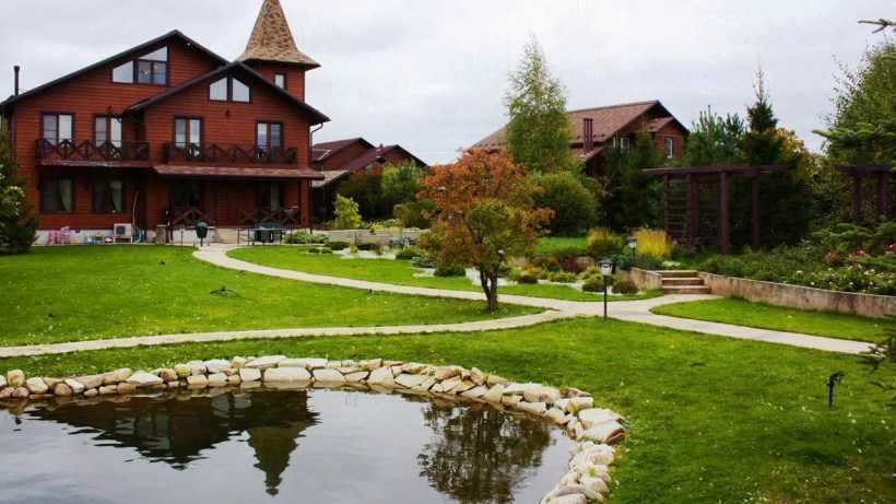 - Постройки распределяют по территории, перемежая с зелеными насаждениями. Хозяйственные строения ставят подальше от глаз, маскируя вертикальным озеленением.