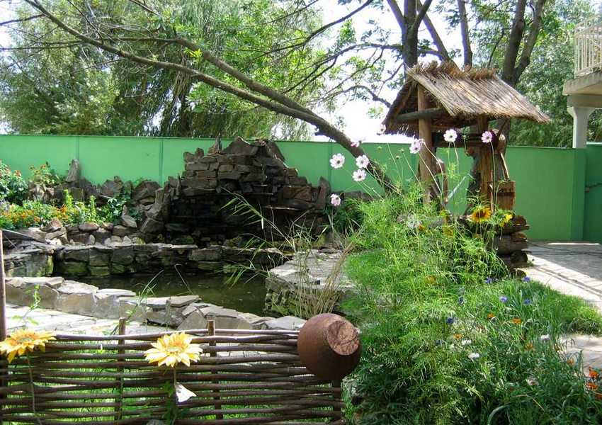 - Декоративный фонтан. Для создания используют традиционные конструкции: сарайчики, мельницы, утварь.