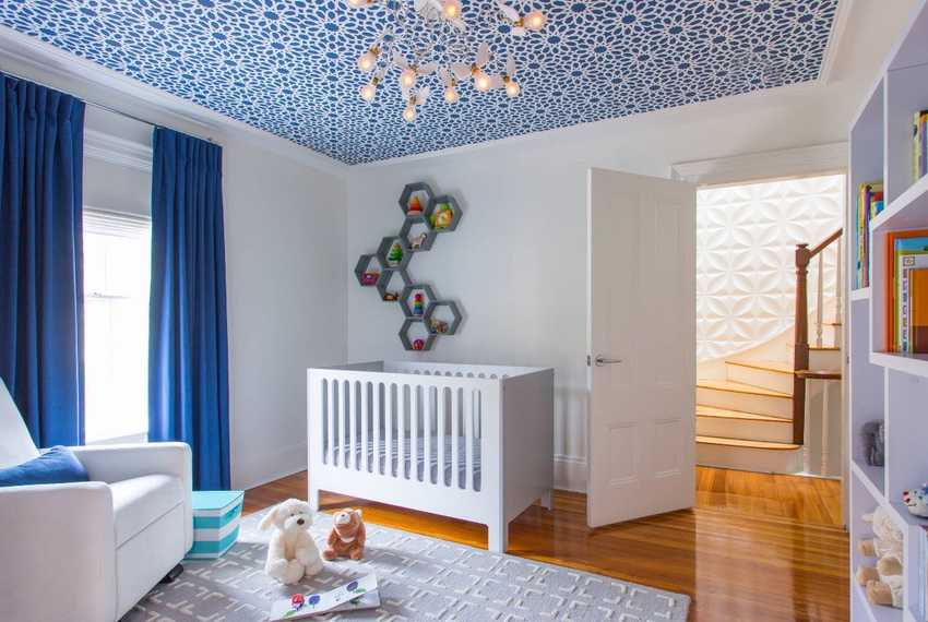 Потолок в комнате ребенка в первую очередь должен быть безопасным, в это понятие входит как его пожаробезопасность, так и нетоксичность и гипоаллергенность.