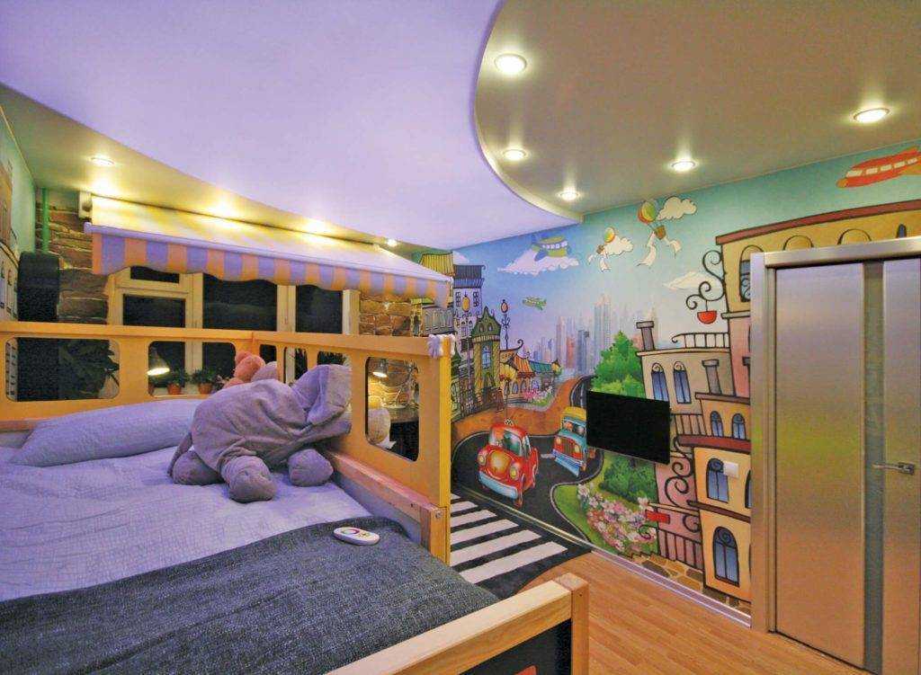 Сюрпризом для любого ребёнка станет потолок, на котором будут изображены его любимые герои мультфильмов или сказок. Здесь вам поможет профессиональный художник или фотопечать. Также специалисты советуют в таком случае воспользоваться проектором.