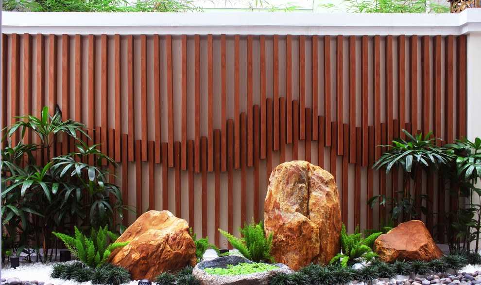 Забор — интересный элемент дизайна. Однако если участок маленький, основательный забор заставит его казаться визуально еще меньшим. Подумайте, может быть, достаточно будет ограждения из сетки? Если вы выбрали японский дизайн, хорошо ограждение из бамбука.