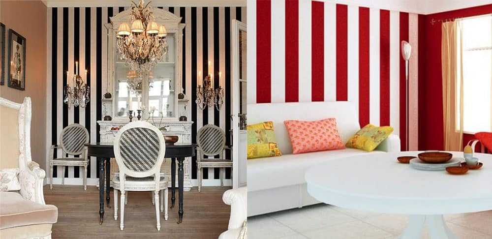 - Обои в вертикальную полоску сделают комнату визуально «выше». Горизонтальные же полосы работают на иллюзию расширения пространства.