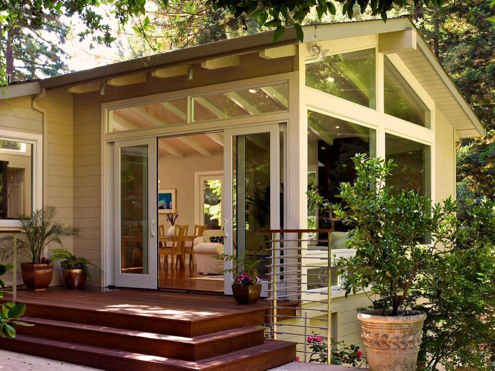 Оснащение закрытой веранды дверью для входа требует грамотного подбора модели. Если выход в пристройку будет осуществляться из дома, то необходимо перед ее строительством подготовить дверной проем и затем установить коробку и дверь. Она может иметь любые параметры и быть металлической, деревянной или стеклянной. Для входа на веранду со стороны сада потребуется установка стеклянной двери. Она будет гармонично дополнять экстерьер объекта. При этом по оформлению стекло в двери и окнах должно быть одинаковым. К возможным вариантам моделей относятся: