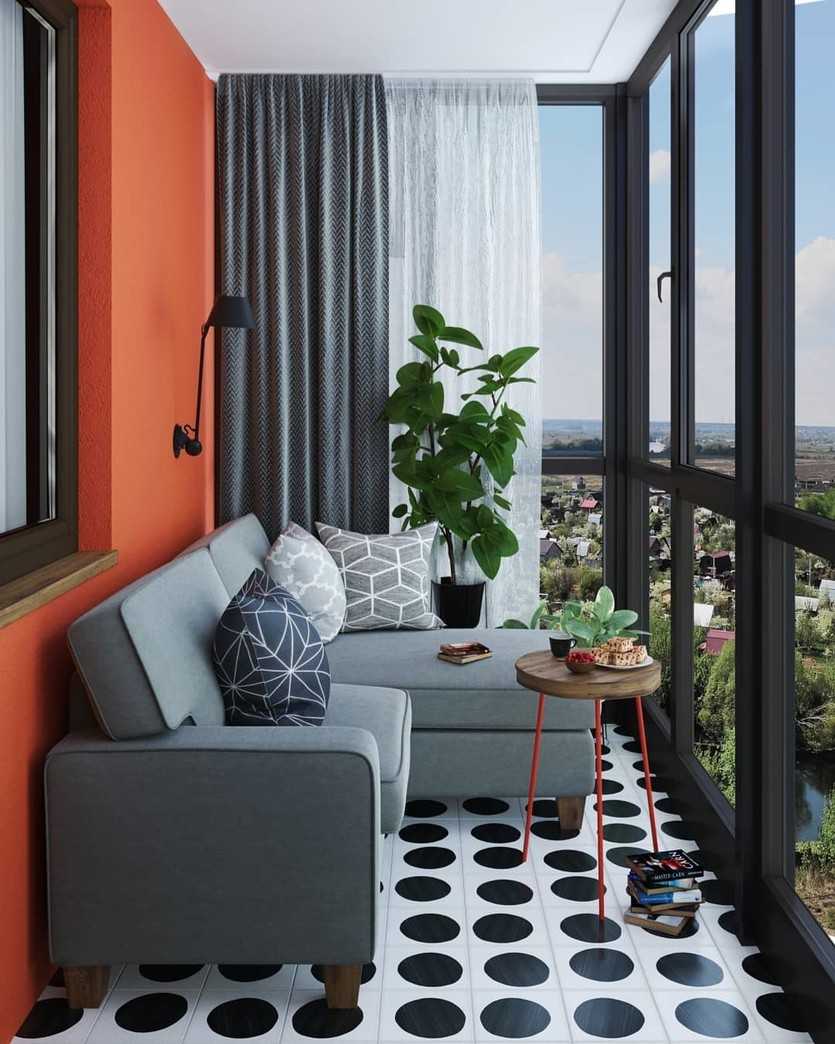 Необычный дизайн лоджии в квартире, фото показывает дизайн интерьера непрямоугольного помещения 8 кв м