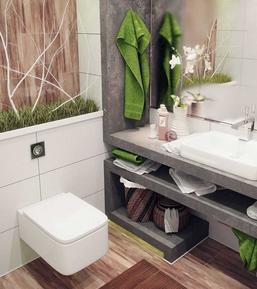 Направление несет простор и свежесть. Интерьер маленького туалета наполнится дыханием природы. В декоре используют только натуральные материалы. Практически полный отказ от синтетических заменителей удорожает отделочные работы. В обстановке царствуют теплые, естественного происхождения оттенки. Упор делается на древесные тона и цвет молодой поросли. Металлические, стеклянные элементы в комнате присутствуют в минимальном количестве. Из аксессуаров можно добавить плетеные корзины, полочки, вазочки. В последние допустимо вставить засохшие ветки.