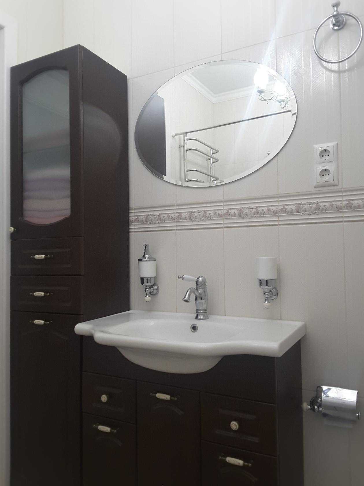 Интерьер туалета наполнен довольно простыми, но при этом «породистыми» аксессуарами. Благородство сквозит в оформлении овальной формы зеркала, заключенного в позолоченную раму, и в конструкционных особенностях бра, декорированных винтажным абажурами. Завораживающая картинка, не правда ли?