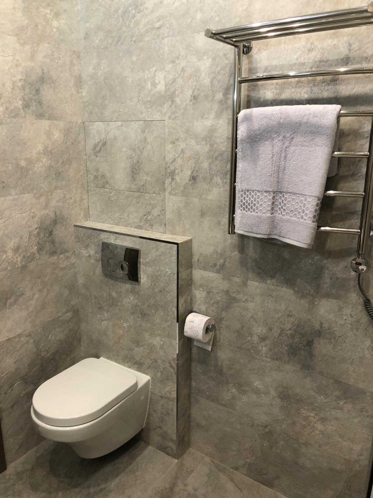 Крупный формат делает помещение визуально больше, а вертикальное расположение плитки в простенке «поднимает» высоту потолка. И конечно, стоит отметить модель унитаза — оптимальная геометрия чаши позволила установить плоский экономичный бачок на 6 литров.