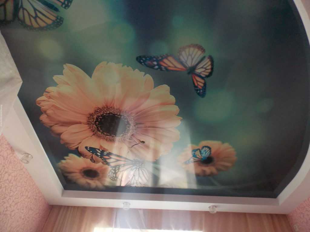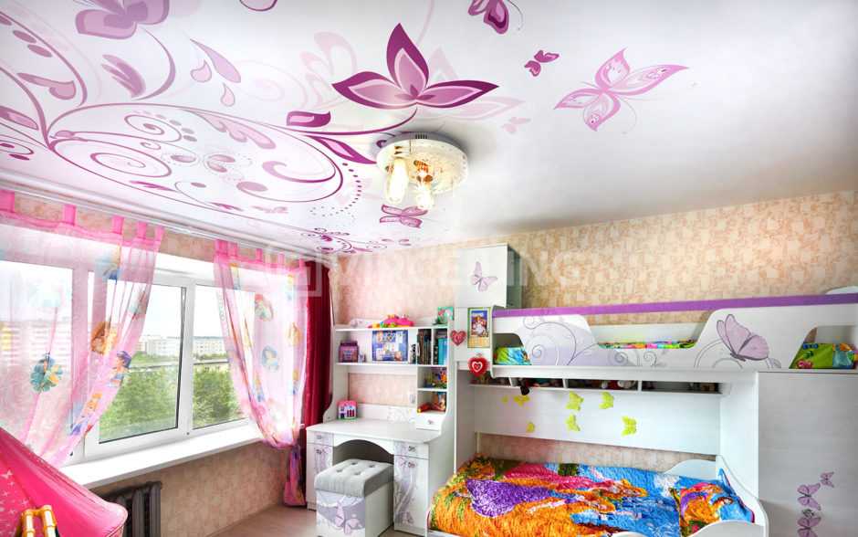 Есть смысл предложить ребенку нечто нейтральное, но приятное глазу: интересно смотрится карта на потолке в детской, изображение растений в макросъемке, для девочек во всех возрастах актуальными остаются бабочки или цветы, можно попробовать интересную не пеструю абстракцию. Для детей постарше подойдут стильные мелкие детали вроде разноцветных горошин или полосок, но при этом потолок не должен притягивать слишком много внимания.
