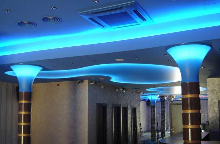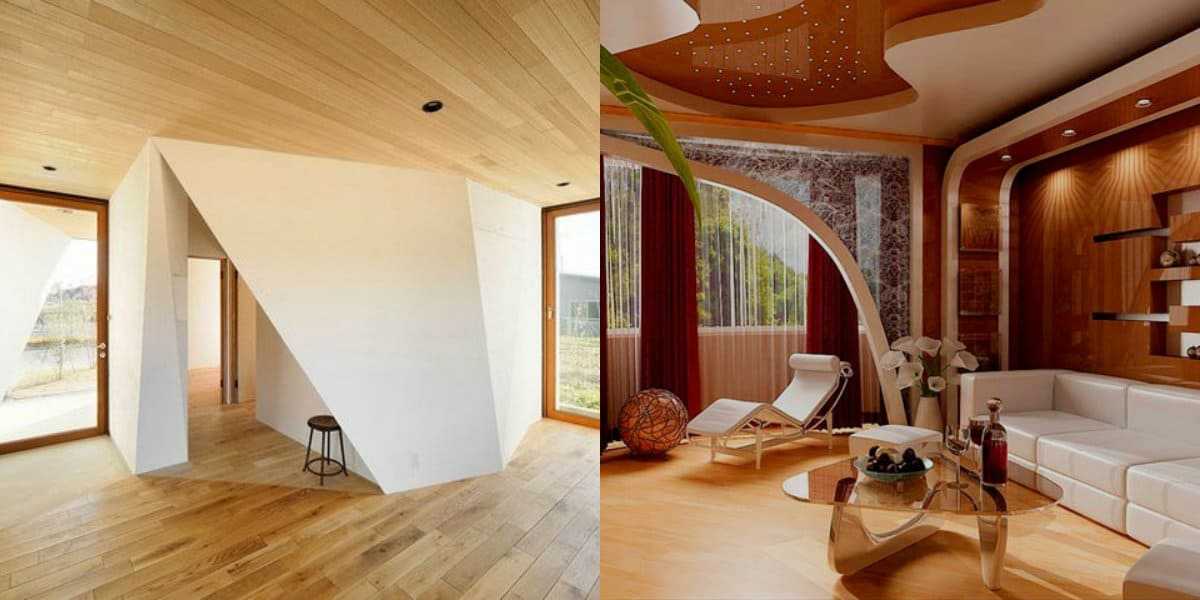При помощи сырья создаются оригинальные геометрические фигуры, которые сложно создать иным способом. Наиболее эффектно такая технология смотрится в просторных помещениях. В хрущевках подобное изобретение не стоит использовать, так как скрадываются до 15 см полезной площади.