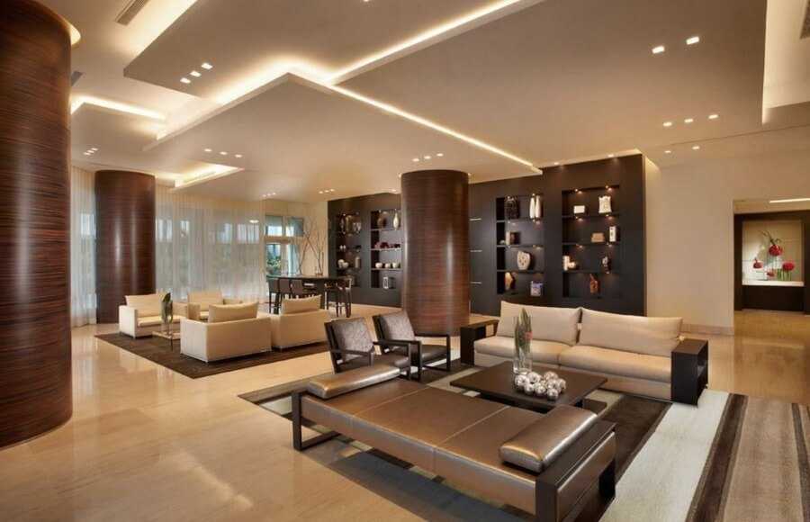 Конструкция и форма потолка – не менее мощный инструмент дизайна чем цвет. Различные формы натяжных потолков для зала позволяют визуально изменить пропорции, увеличить высоту или расширить.