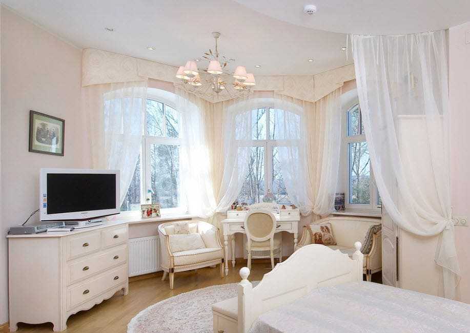 Вдоль стен расставлены белые шкафы с застекленными секциями с витражными фрагментами. Между ними расположен камин – неотъемлемый атрибут классики и домашнего уюта. Мраморная облицовка и готические штыри ограждающего забора, кованые элементы, полка с зеркалом сверху отвечают за функциональность и эстетику.