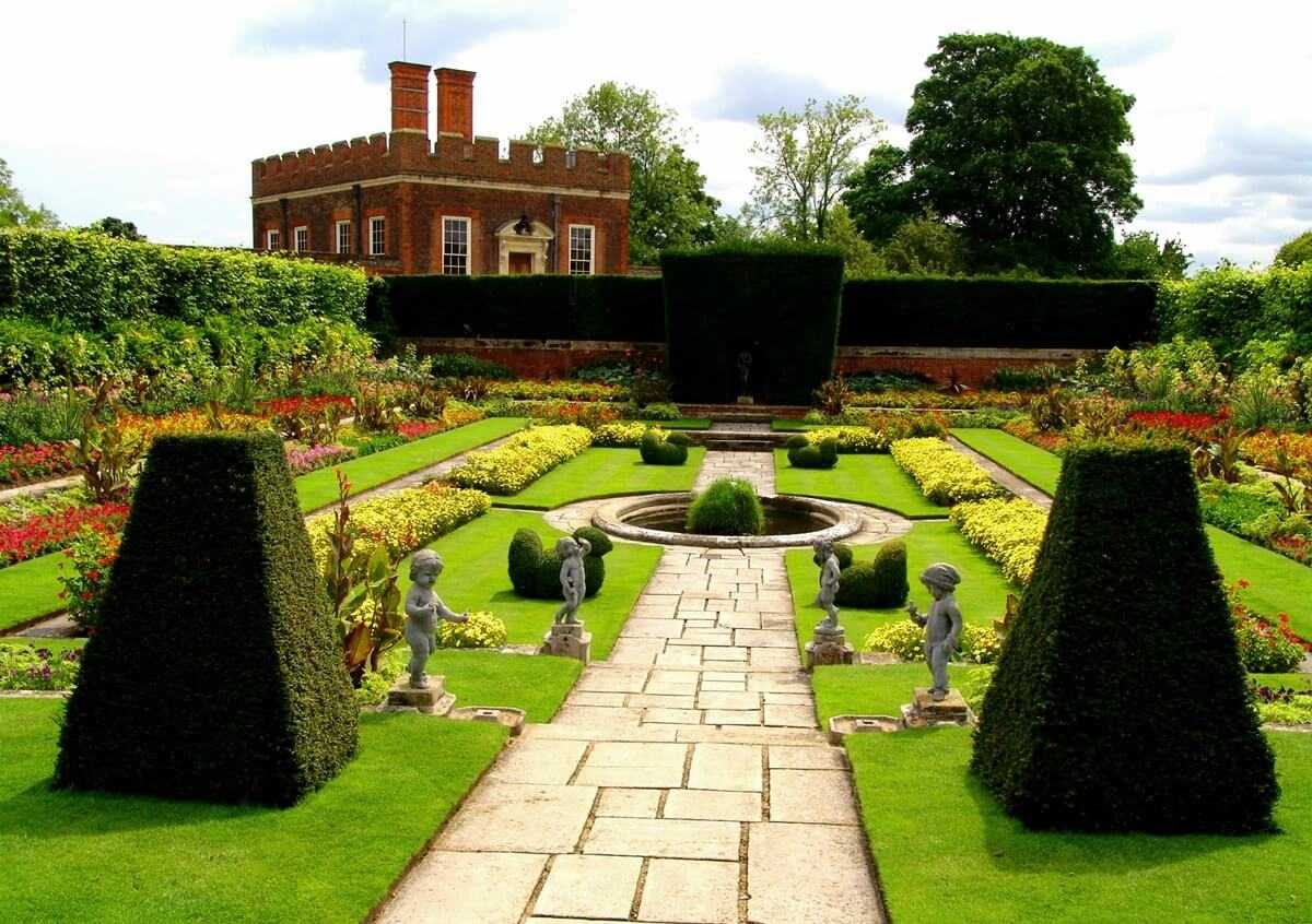 - ухоженный прямоугольный газон с расположенной в центре античной статуей, фонтаном или изысканной цветочной композицией;