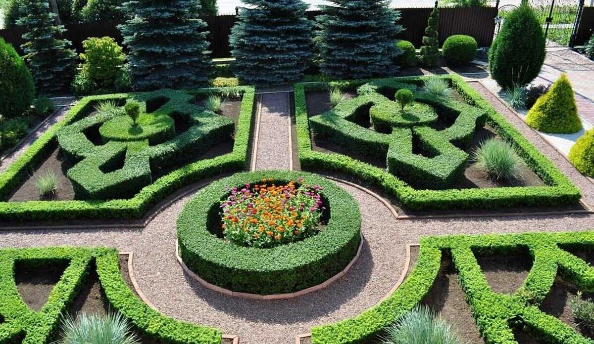 - использование невысоких деревьев и кустарников с густой кроной правильной формы — туй, кипарисов, лип, клёнов;