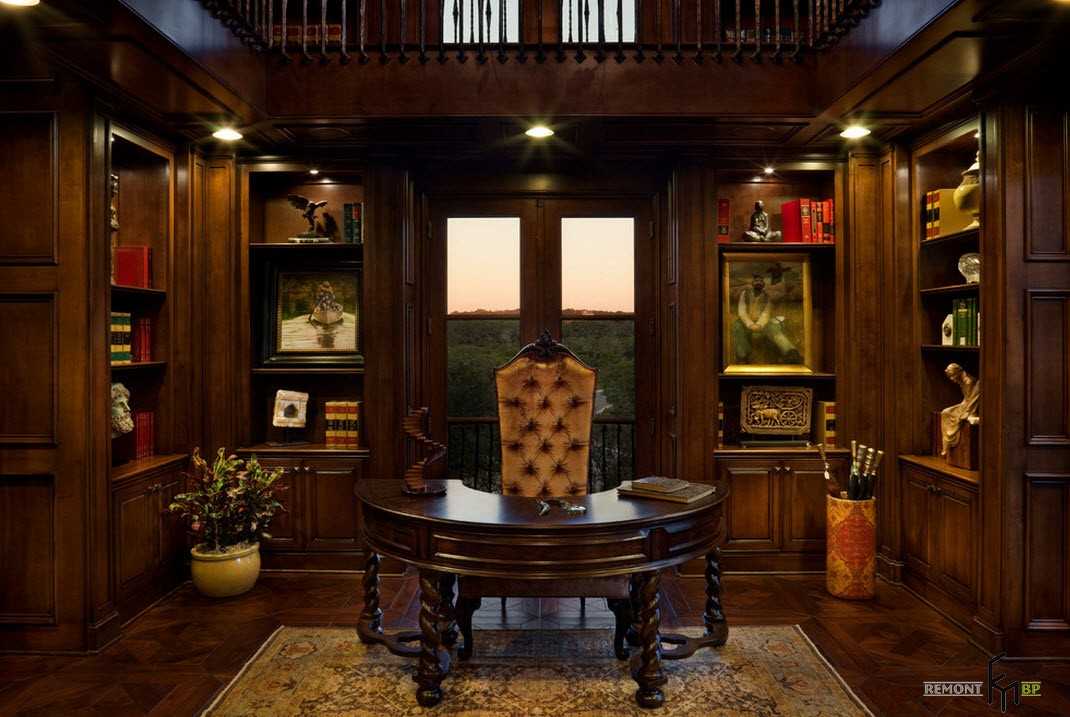 Кабинет полностью обшит деревом. Массивные предметы мебели выдают в хозяине этого кабинета волевого сильного человека, принимающего изо дня в день серьезные решения. Книги на полках и множество декоративных аксессуаров также подобраны для поддержания общего впечатления от помещения. Большое окно освещает комнату днем, а в вечернее время можно использовать светильники, которые размещены тут в большом количестве.
