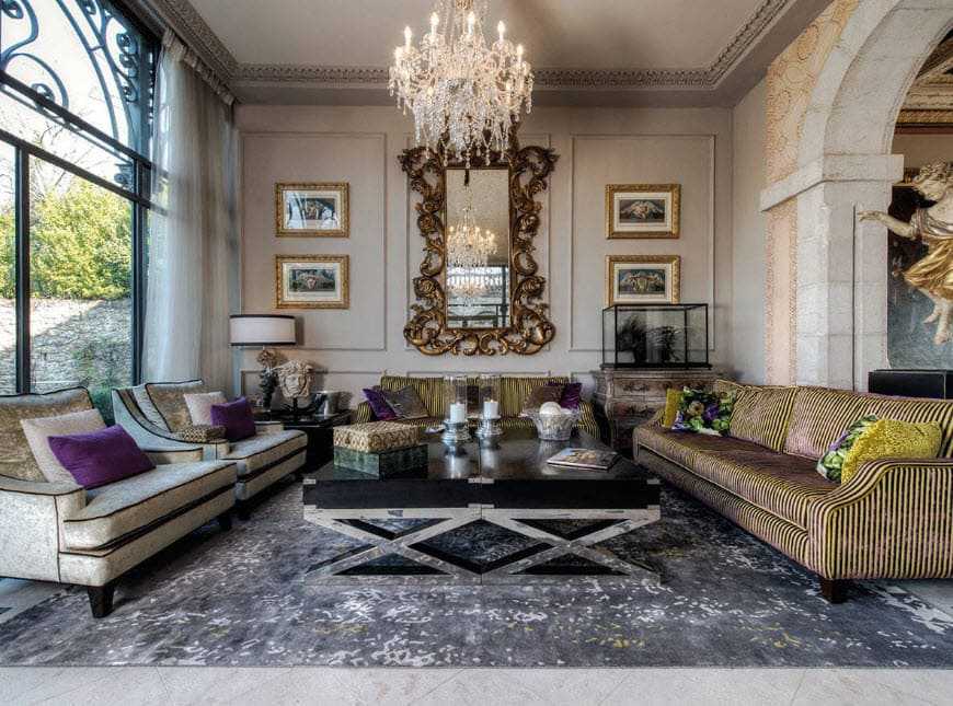 Интерьерные предметы и атрибуты сочетаются по фактуре и отделке. Приоритетность материалов и ритмичная последовательность в их размещении, эклектическое сочетание внутри комплектов напоминают об арт-деко. Современная мягкая группа дополнена парой кресел, выполненных в другом формате. От круглого бархатного пуфа у камина, бахромы и фигурных ножек веет историей и помпезностью.