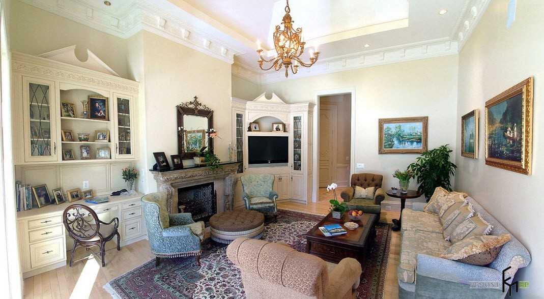 Картинам, написанным в одной манере, в объемных фактурных рамах придается особое значение. Они развешены по периметру и занимают место на мебельных полках. Трепетное отношение к живописи, фотографиям и раритетным вещи указывает на культивирование семейных обычаев. Большое зеркало в типичном обрамлении под стать художественно исполненным багетам.