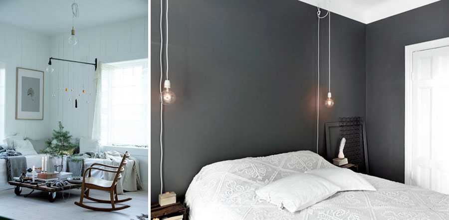 Они могут заменить центральное освещение в комнате. В этом случае вместо люстры с потолка свисает много лампочек на длинных проводах, иногда собранных в пучок. Здесь также будут полезны варианты ламп в стиле ретро, при этом лучше выбирать много маломощных лампочек.
