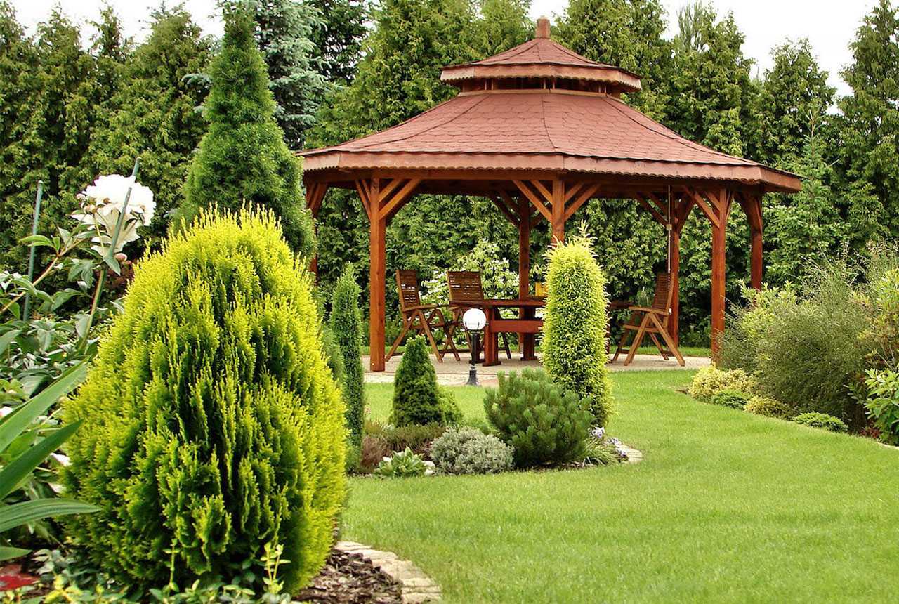 Задний двор лучше оформить как место для отдыха, установив там скамейки или беседку для утреннего чаепития. Постройки, увитые плющом или виноградом, будут защищать в летний зной или от небольшого дождя. Это станет любимым местом для уединённого отдыха или романтического ужина.