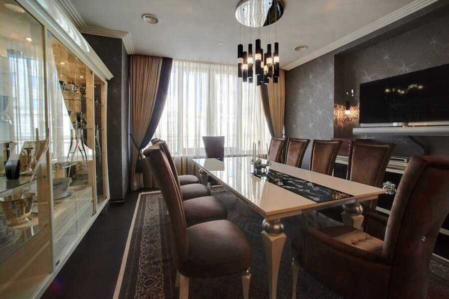 При создании интерьера и экстерьера дома в современном стиле обязательно вносят роскошные детали, которые могут быть частью либо основой дизайна. На фото домов в стиле модерн часто можно увидеть необычные балконы и эркеры, арочные дверные и оконные проемы. Необходимое условие интерьера – высокие потолки различной кривизны и формы.