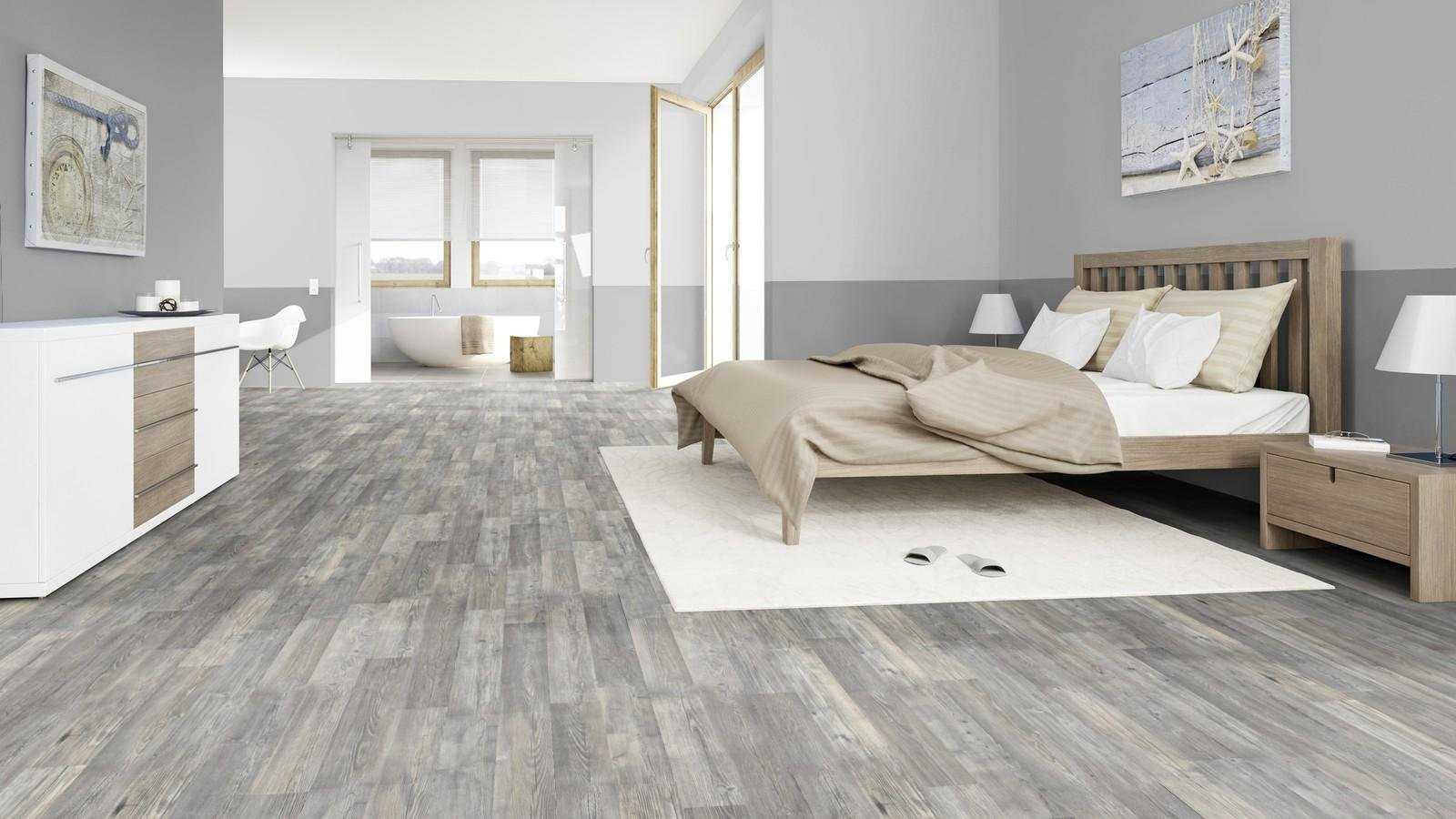Бело-серый слегка состаренный ламинат в стиле прованс подчеркнет климат французской провинции, имитируя состаренные крашенные доски.