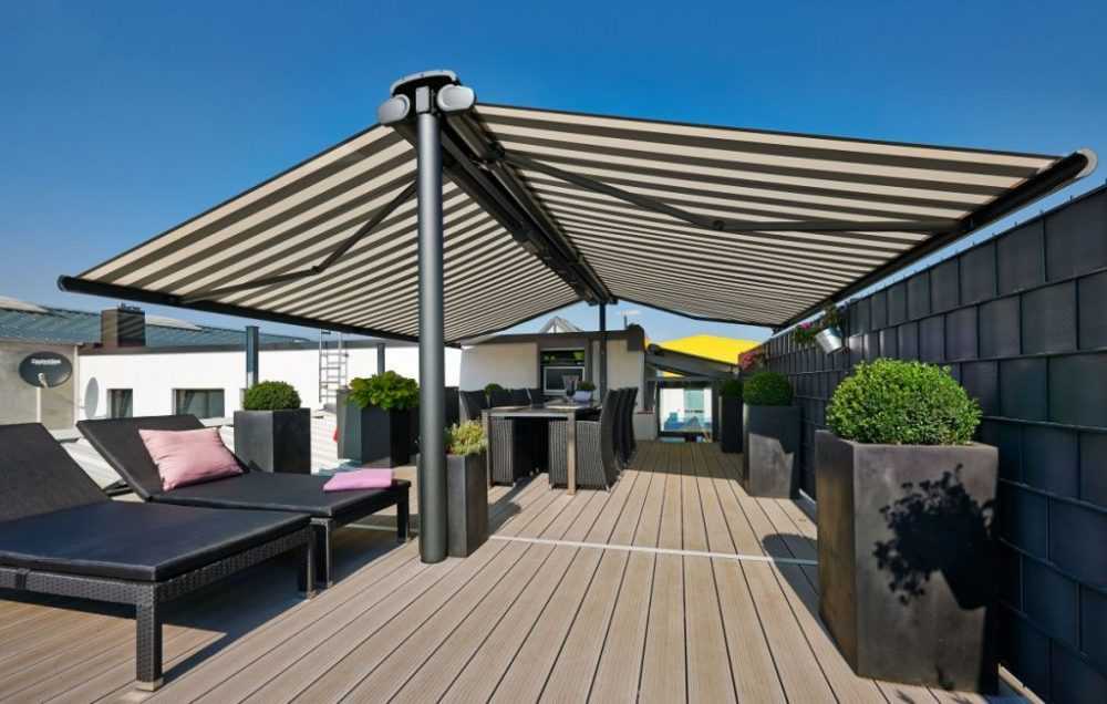 Это вариант раздвижной крыши. Представляет собой водоотталкивающий акриловый шатер с алюминиевым каркасом. Такая кровля имеет системы шарниров, благодаря чему можно регулировать ее наклон. Управление осуществляется вручную, при помощи дистанционного устройства или автоматически в зависимости от типа модели. В продаже существую самые разные по дизайну, размеру и комплектации маркизы, позволяющие сделать жилую крышу более привлекательной по дизайну.
