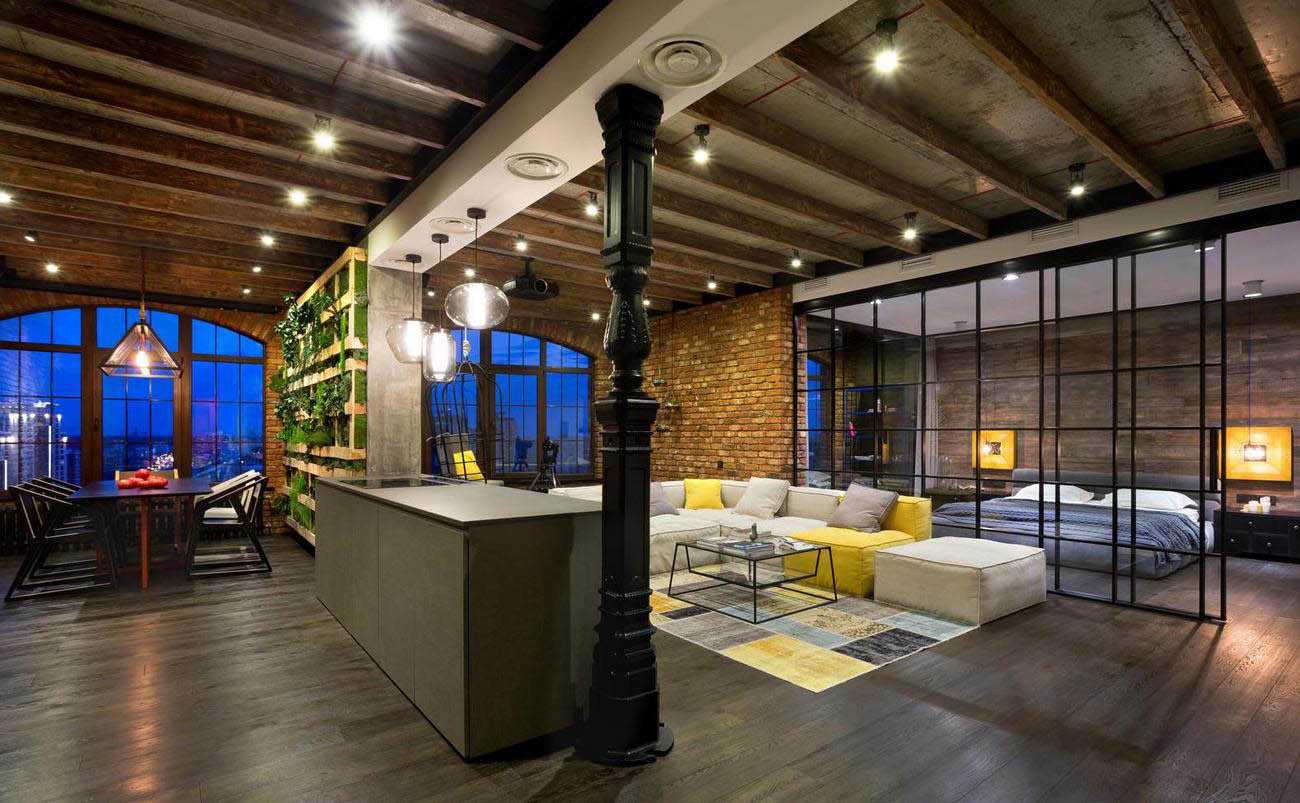 Дизайнеры часто крепят к металлическим балкам лампы: обилие света приветствуется в современных стилях интерьера. Оригинально смотрится соседство алюминиевых конструкций со стенами «под кирпич».