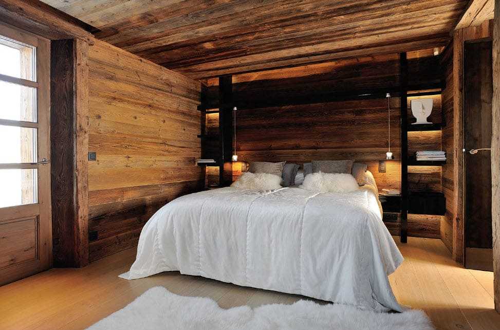 Что касается техники, то открытые приборы должны иметь коричневый цвет или же эффект старины, остальные предметы современной жизни человека лучше спрятать за массивные деревянные поверхности. Кровать – деревянная с оригинальным резным изголовьем. В целом для стиля шале характерна массивная мебель, дополненная покрывалами.
