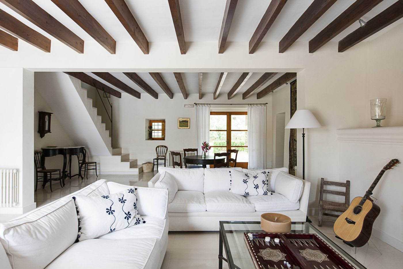 Открытые потолочные балки больше подойдут для гостинных и холлов двухэтажного дома — то есть помещений, где их использование позволяет высота.