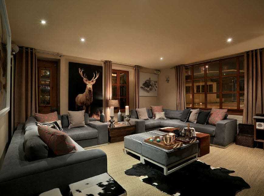 Мебель домика в стиле шале должна быть комфортной и простой. В гостиной лучше всего поставить большие и мягкие диваны, обтянутые натуральной тканью или кожей. Вокруг камина можно расставить кресла с «ушками», дополняющие уютную атмосферу. Столы – деревянные, стулья и кресло-качалка – плетеные. В качестве декора используют плед с рисунком в клетку (классический вариант) или цветные подушки. На кухне мебельный гарнитур должен иметь эффект старины.