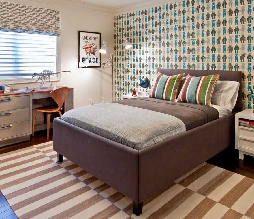 Можно подобрать постельное бельё с принтом, который понравится хозяину комнаты и добавить декоративных маленьких подушек.