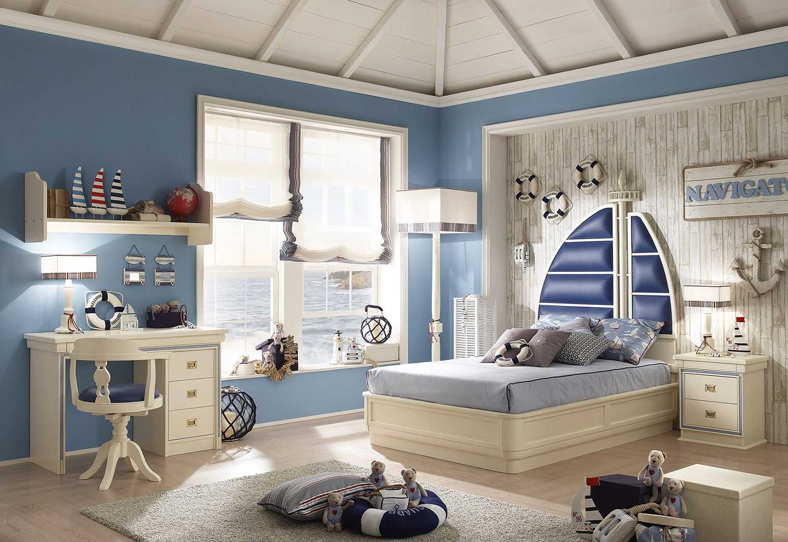 Распространенный вариант интерьера. Здесь используйте любые цвета морской тематики. Главное – решить какой именно будет основным. Что касается основного материала, должно быть именно дерево. Например, пол из паркетных досок, на стены — панели из дерева. Мебель должна соответствовать основному стилю. Кровать можно заказать например, в виде корабля со штурвалом или обычной лодки, а стол лучше всего – из деревянной доски.