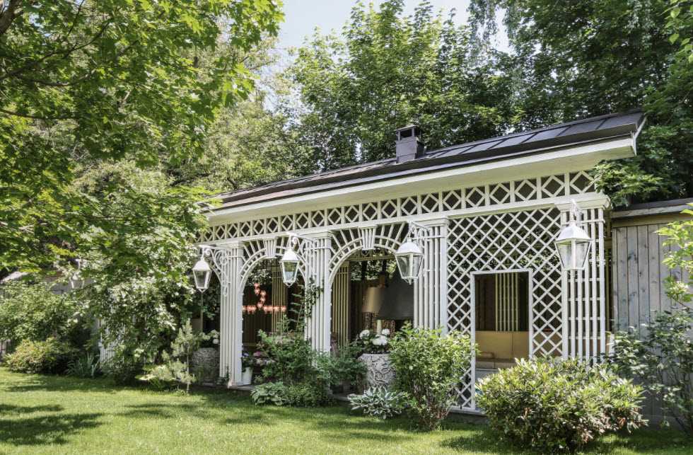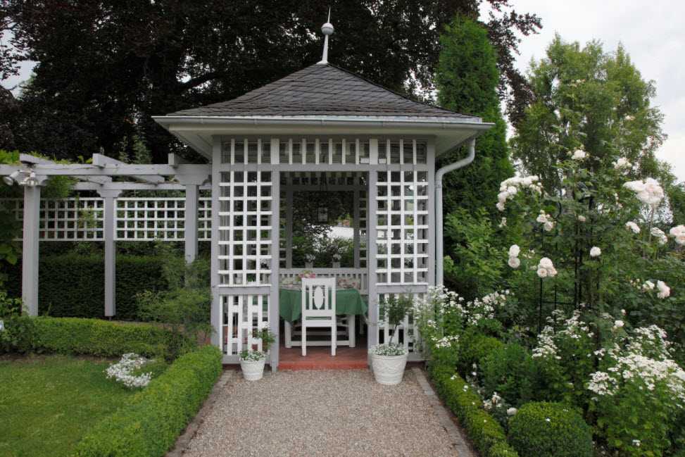 Стильная белая беседка из дерева не перестанет удивлять ваших гостей