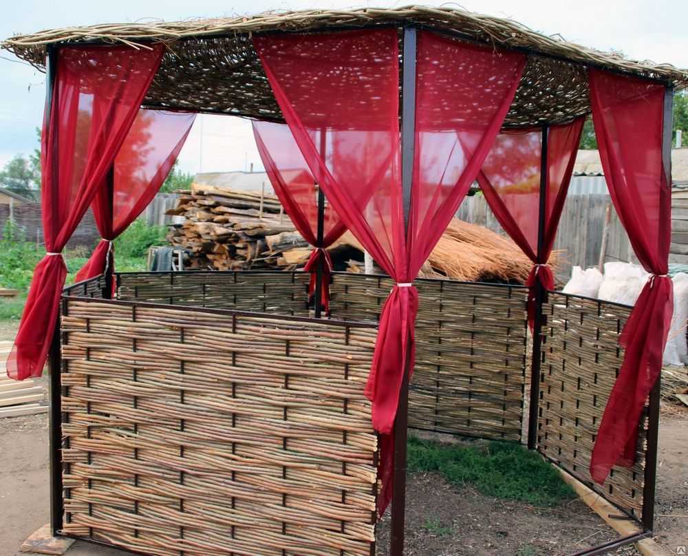 Эстетично выглядят конструкции из тонких прутьев и веток, которые образуют плетеную беседку. Благодаря такому плетению можно добиться укрытия помещения от солнца, но в то же время люди будут находиться на свежем воздухе и не потеть внутри от жары.