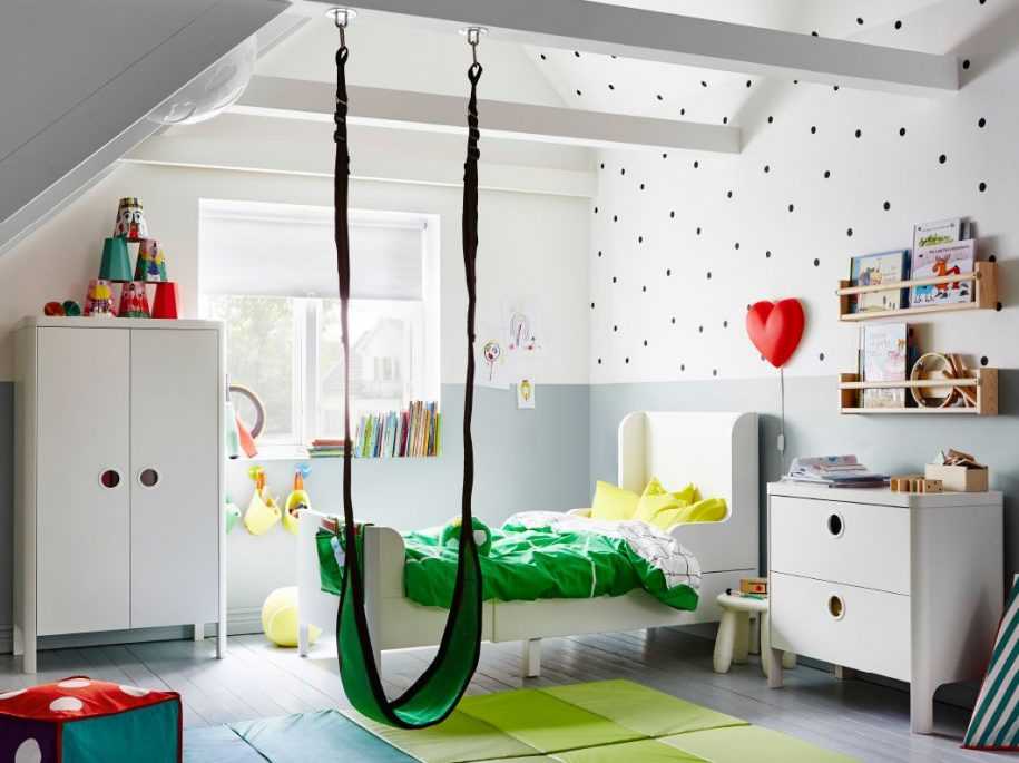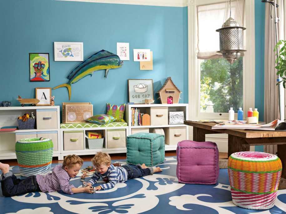 Зона для игр.Чтобы визуально разграничить зону. Воспользуйтесь зонированием с помощью разных цветов либо обоев, которые можно комбинировать. Стенку у которой будут играть дети, оклейте яркими фотообоями.Место, где малыши играют машинками, конструктором, куклами, мягкими игрушками, объедините со спортивной. Подвесьте канат. Надёжно установите турник. Очень хороша стенка шведская под потолок. Освещение оборудуйте ярким для всей комнаты. Купите детям наборы для ролевых игр в доктора, повара, полицейского, пожарника, железнодорожника, мастера по ремонту автомобилей. Мастерская особенно порадует мальчика, а остальные игры хороши для мальчика и девочки
