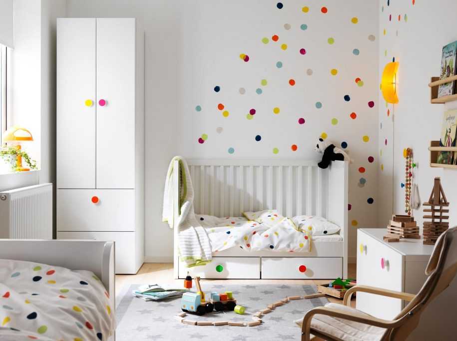 Хит последних лет — магнитные и матричные краски, которые позволяют максимально использовать пространство. Их комбинация позволит вам прикрепить магниты к стене и написать мелом. Стикеры для стен или раскраски в виде обоев также хорошая идея. В детской маленькой комнате нужно использовать каждый закуток, поэтому подоконник может стать галереей машин или кукол. Стоит попытаться включить ребенка в украшение комнаты — малыш может выбрать наволочки или цвет ковра.