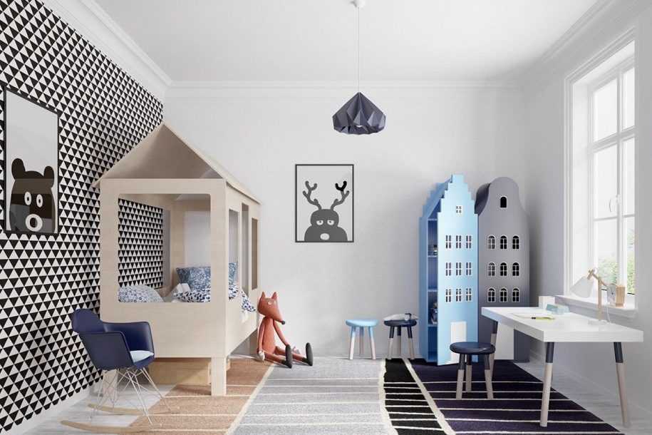 Скандинавский. Этот стиль серьезный и лаконичный, но преображает детскую комнату. Нежные древесные оттенки, изображения милых лесных зверей, как будто нарисованных маленькой ручкой, яркие предметы декора, открытые полки и много естественного света — вот отличительные черты этого направления.