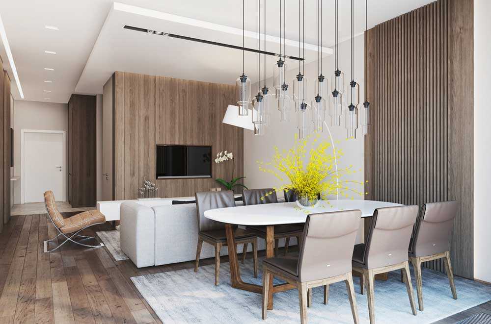 - Обеденная зона освещается отдельно. Хорошо подойдет пара висящих лаконичных плафонов или одна крупная люстра над столом.
