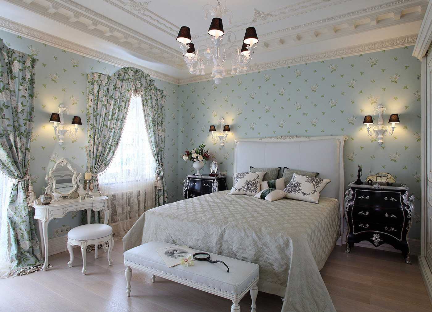 На фото спальня в стиле прованс и обои с цветами на стенах.
