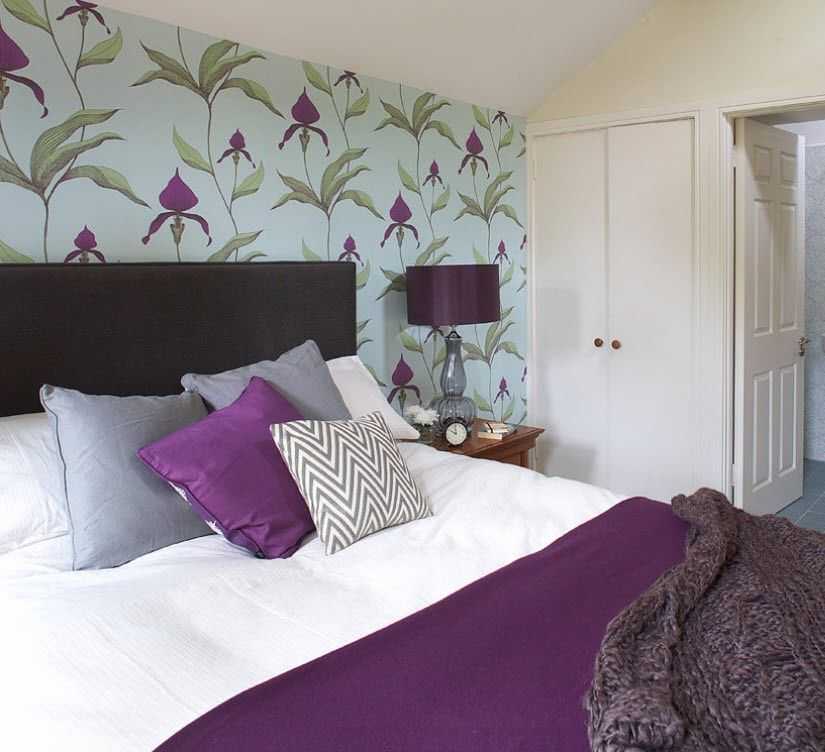 в качестве декоративного акцента можно использовать яркие насыщенные обои. Но чтобы не перегружать интерьер, поклейте их на стену за изголовьем кровати;