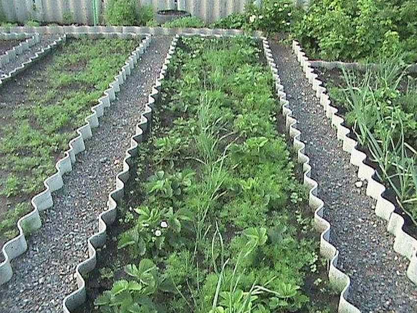 - Шифер. Несложно и недорого можно оформить грядки шифером волнообразным или плоским. Огород с такими самодельными бордюрами будет выглядеть довольно привлекательно.