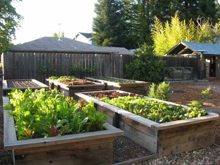 Красивые грядки с использованием деревянных бортиков и насыпью между рядами.