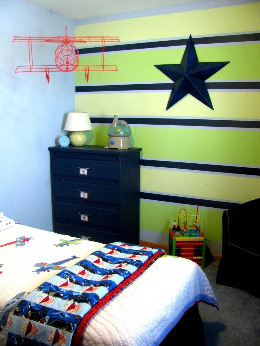 Пестрые картинки, которые любят дети также помогут родителям мальчиков решить сложный вопрос с дизайном комнаты. Только не стоит использовать слишком яркие цвета, которые могут агрессивно воздействовать на психику ребёнка.