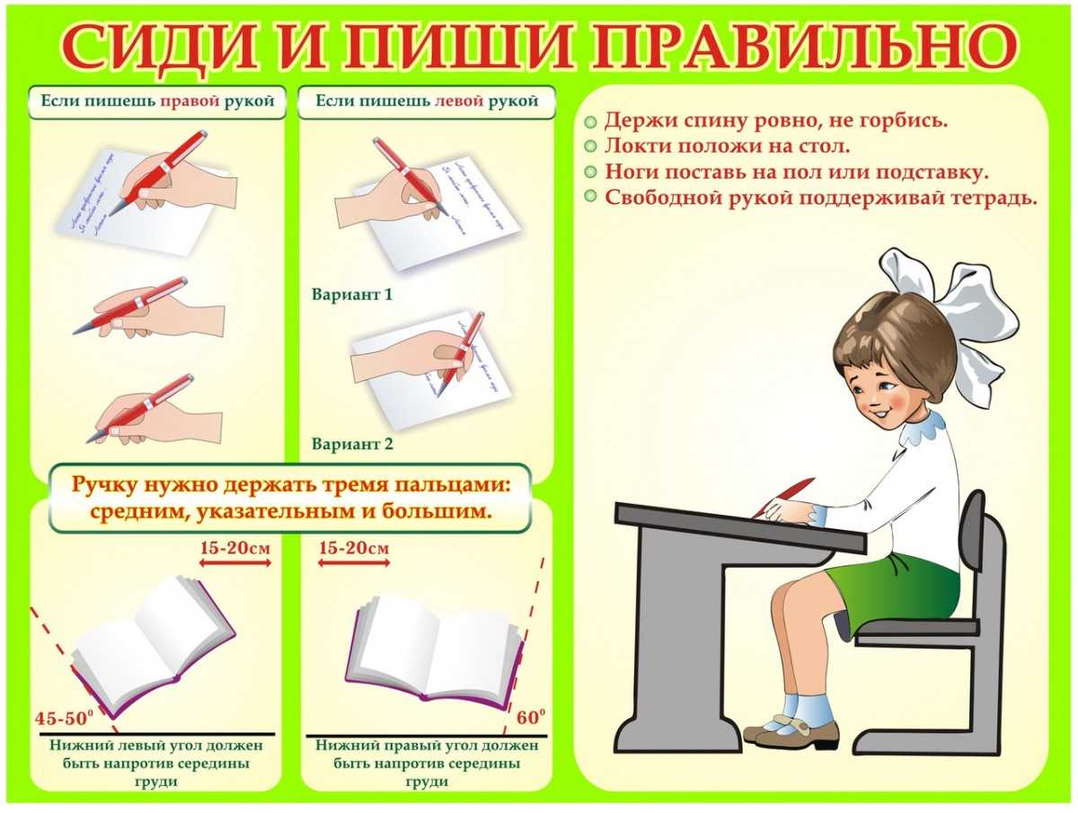 Правильная поза школьника за столом – ноги на полу, колени согнуты под прямым углом. При этом пространство под столом должно быть достаточным – не менее 50 см в ширину и более 45 см в длину. Расстояние от коленей до нижней поверхности столешницы — не менее 15 см.