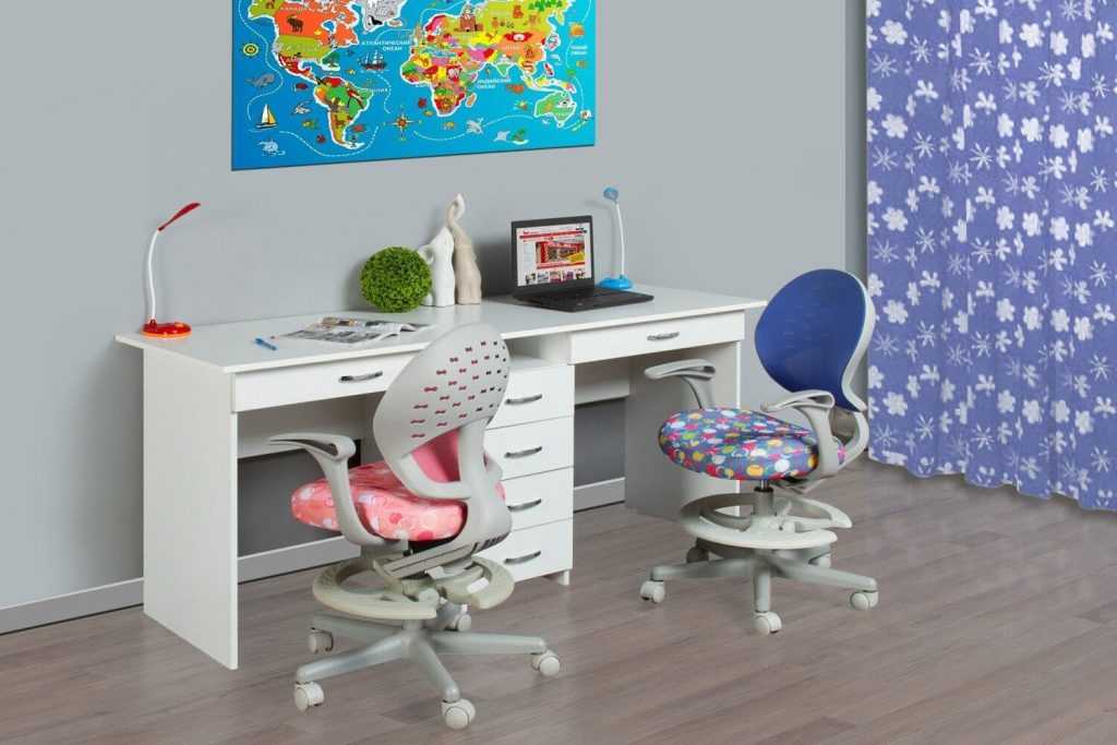 Производители выпускают письменные столы для двух детей, они оснащены большой столешницей и набором полочек и ящичков с двух сторон или посередине. Главное, чтобы в комнате было достаточно места для его размещения. А также здесь следует продумать дополнительное освещение для двух рабочих мест.
