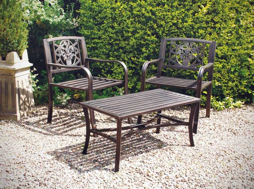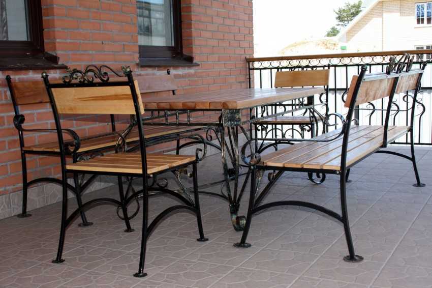 Мебель только из металла практически не встречается, так как данный материал сложен в обработке и неприятен в холодную пору года. Хотя иногда встречаются кованые кресла или столы. При изготовлении металл используется как основание или каркас, на которые крепятся деревянные или пластиковые элементы. От образования коррозии такую мебель стоит покрасить краской или специальными защитными составами.