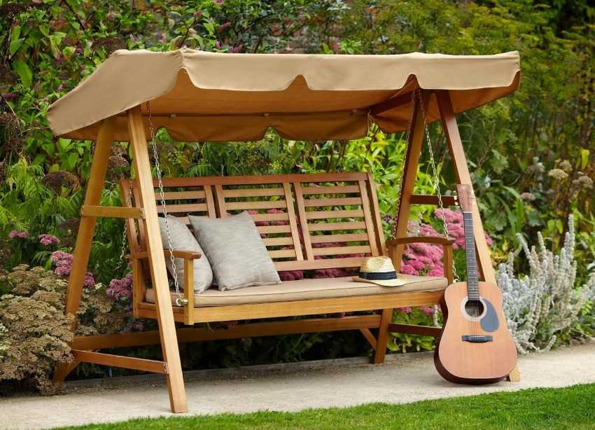 Также достаточно популярной является деревянная мебель сделанная из поддонов. Такую конструкции очень просто сбить, покрасить и пропитать. Подушки также можно пошить самостоятельно или купить в магазине садовых аксессуаров.